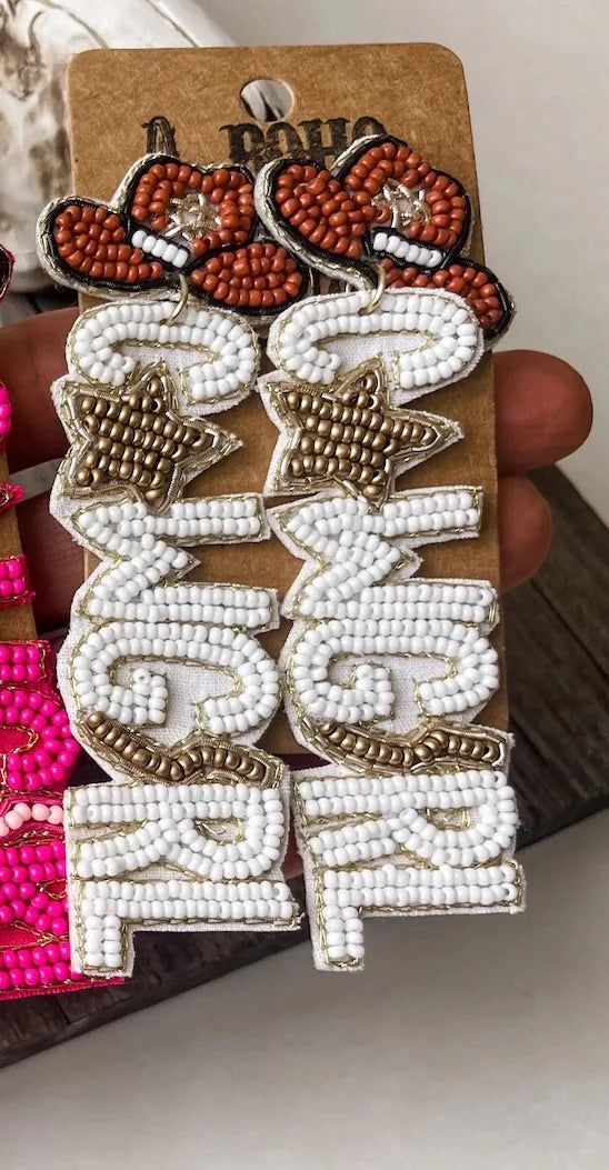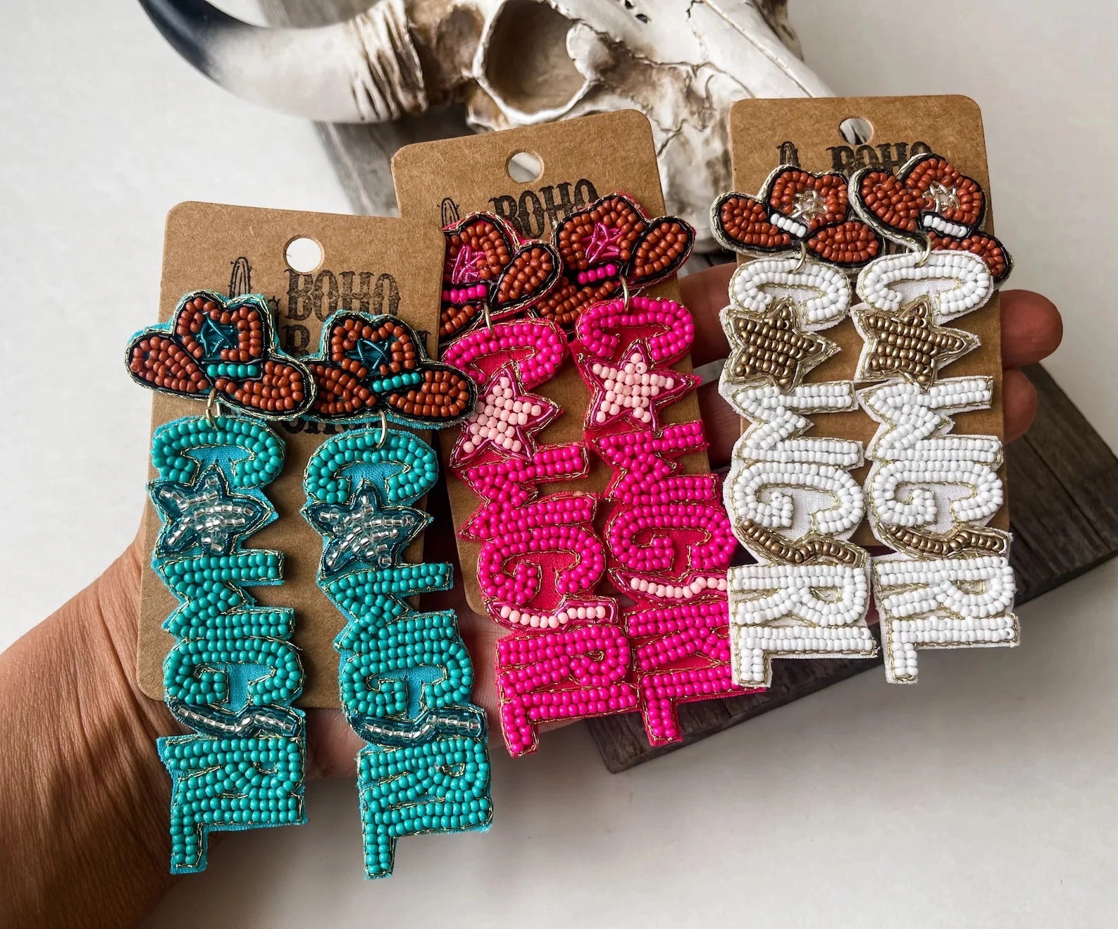 Embrace your inner cowgirl with our Hand-Beaded "COWGIRL" Cowboy Hat Earrings. Whether you're two-stepping at the rodeo or adding a Western flair to your everyday ensemble, these earrings are sure to make a statement.