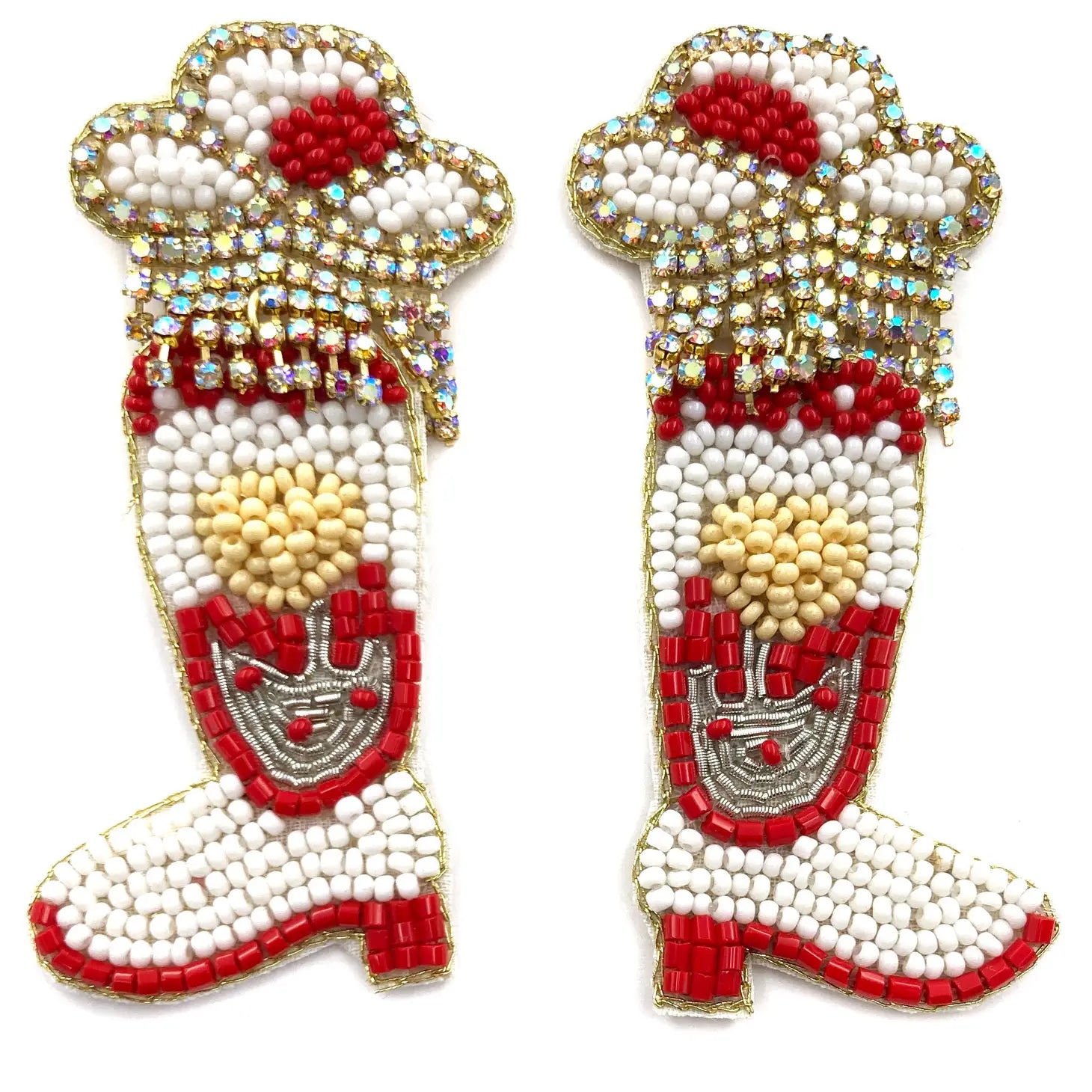 Add a touch of cowboy-inspired elegance to your jewelry collection with our White/Red and Gold Beaded Cowboy Boot Earrings. Order yours today and step out in style!
