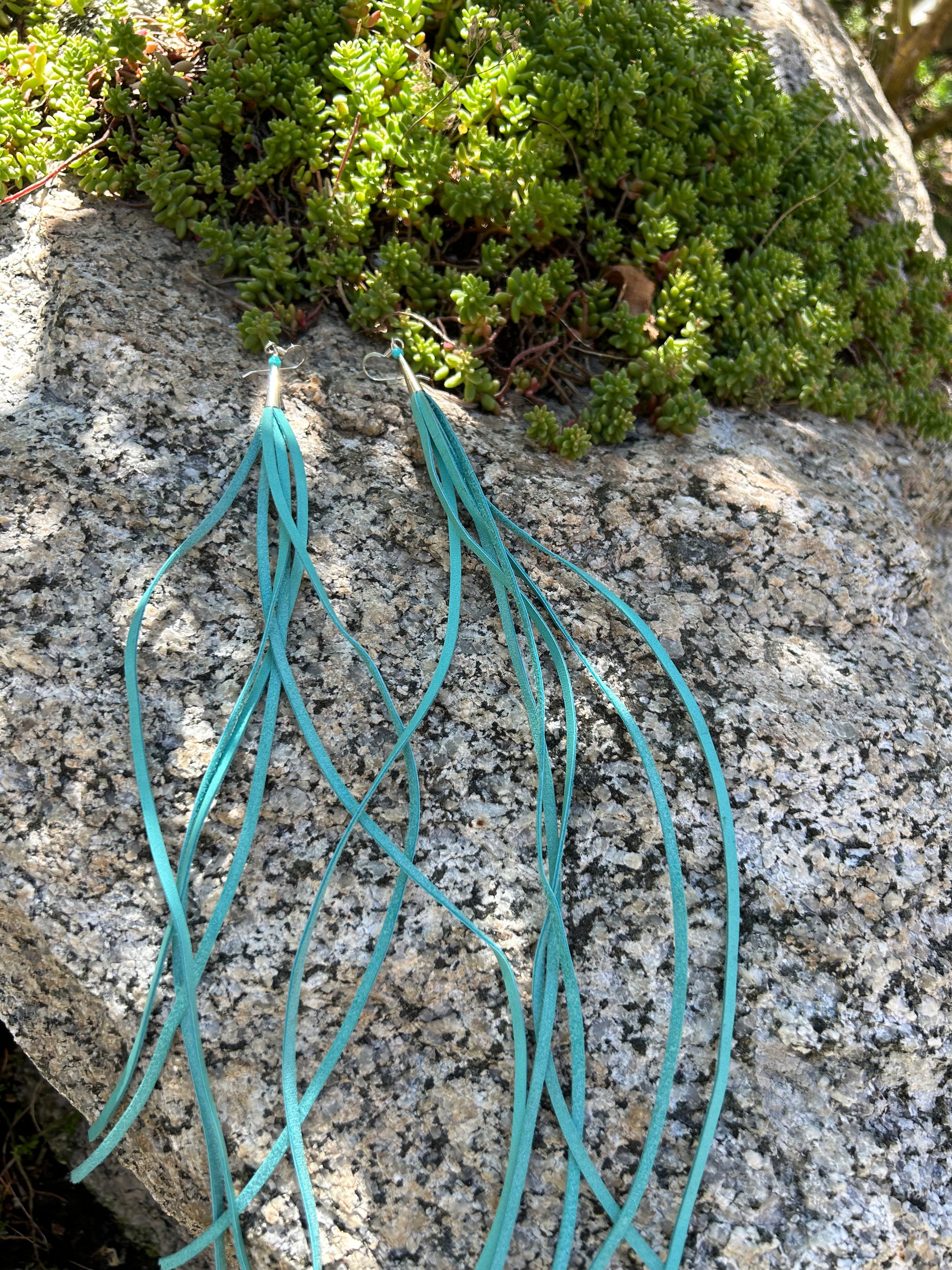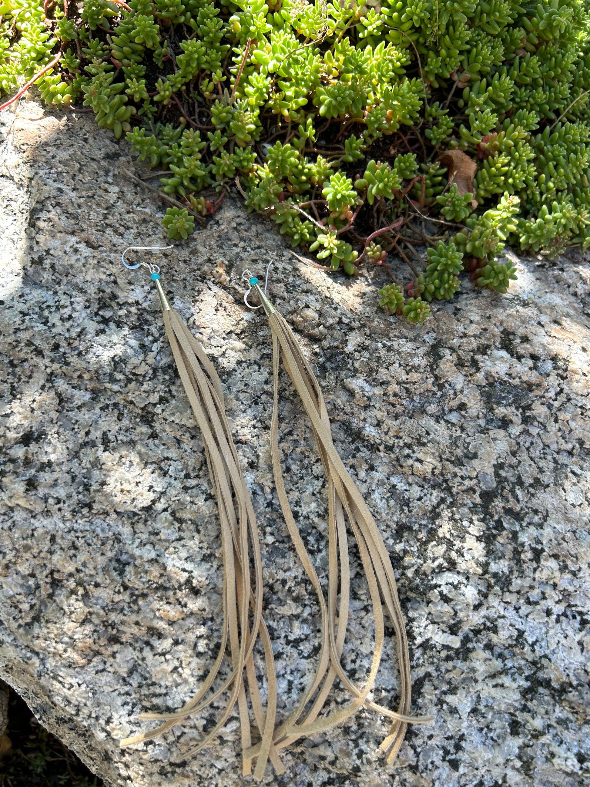 Get ready to steal the spotlight and turn heads with our Extra Long Silver Earrings with Leather Fringe. These latigo earrings are the perfect accessory to add some true boho flair to your look with genuine Kingman turquoise, sterling silver, and extra-long leather fringe measuring a full 12 inches. Trust us, they’ll definitely get you some attention!
