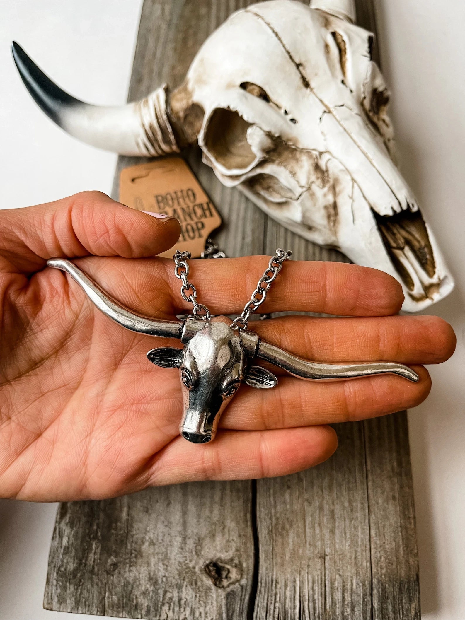 Make a bold statement with our Silver Bull Longhorn Pendant Necklace, a striking piece that captures the essence of Western charm and rugged elegance.