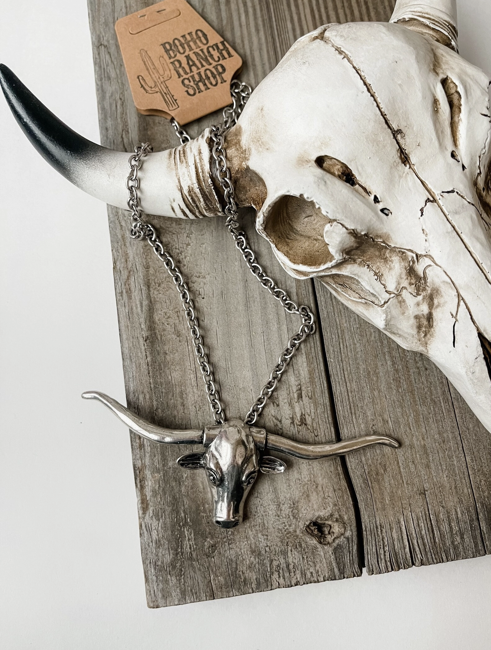 At the heart of this necklace lies the statement large longhorn pendant, exuding strength and power. Its intricate design and intricate detailing make it a standout piece that is sure to turn heads wherever you go.
