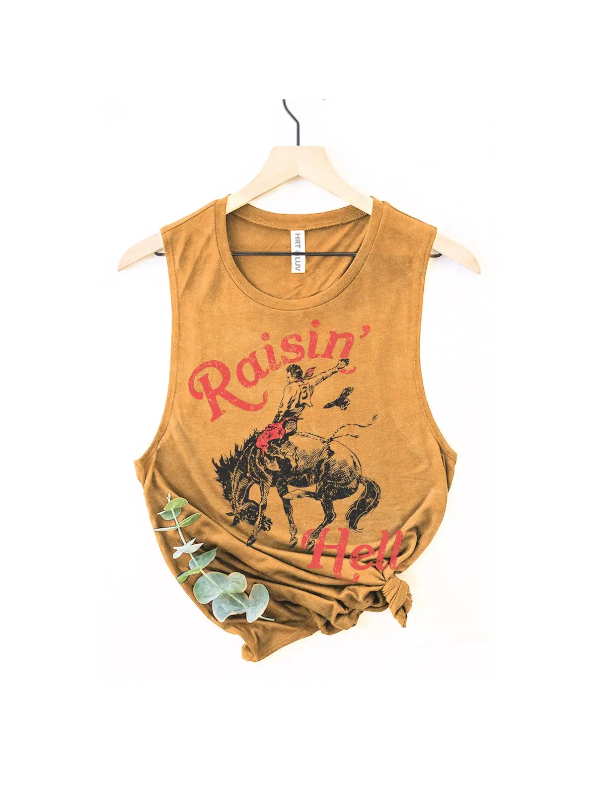 Embrace your inner rebel with our Women's "Raisin' Hell" Red Graphic Tank Top. Whether you're hitting the town or lounging at home, this tank is sure to make a statement wherever you go.