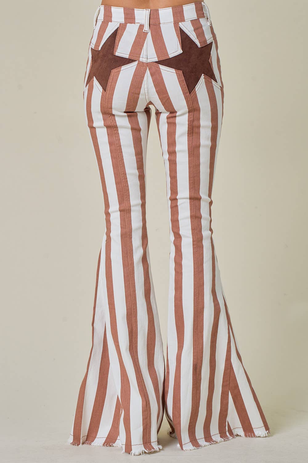 Introducing the Rust and White Striped Flare Denim Bellbottom Pants – a bold, bohemian statement piece perfect for adding a touch of Western flair to your wardrobe. These bellbottoms feature a striking rust and white stripe design, with eye-catching brown suede stars adorning the back, blending retro-inspired fashion with modern boho vibes.
