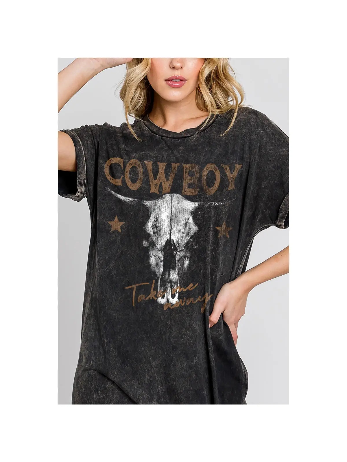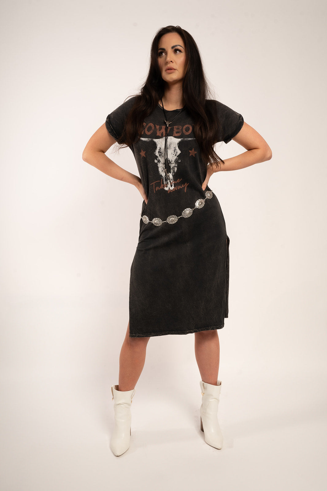 Introducing the Take Me Away Cowboy Graphic Dress in Mineral Black – a fusion of comfort and style that effortlessly blends the rugged charm of the wild west with contemporary fashion. Crafted from high-quality cotton, this dress ensures a soft touch against your skin, providing all-day comfort.