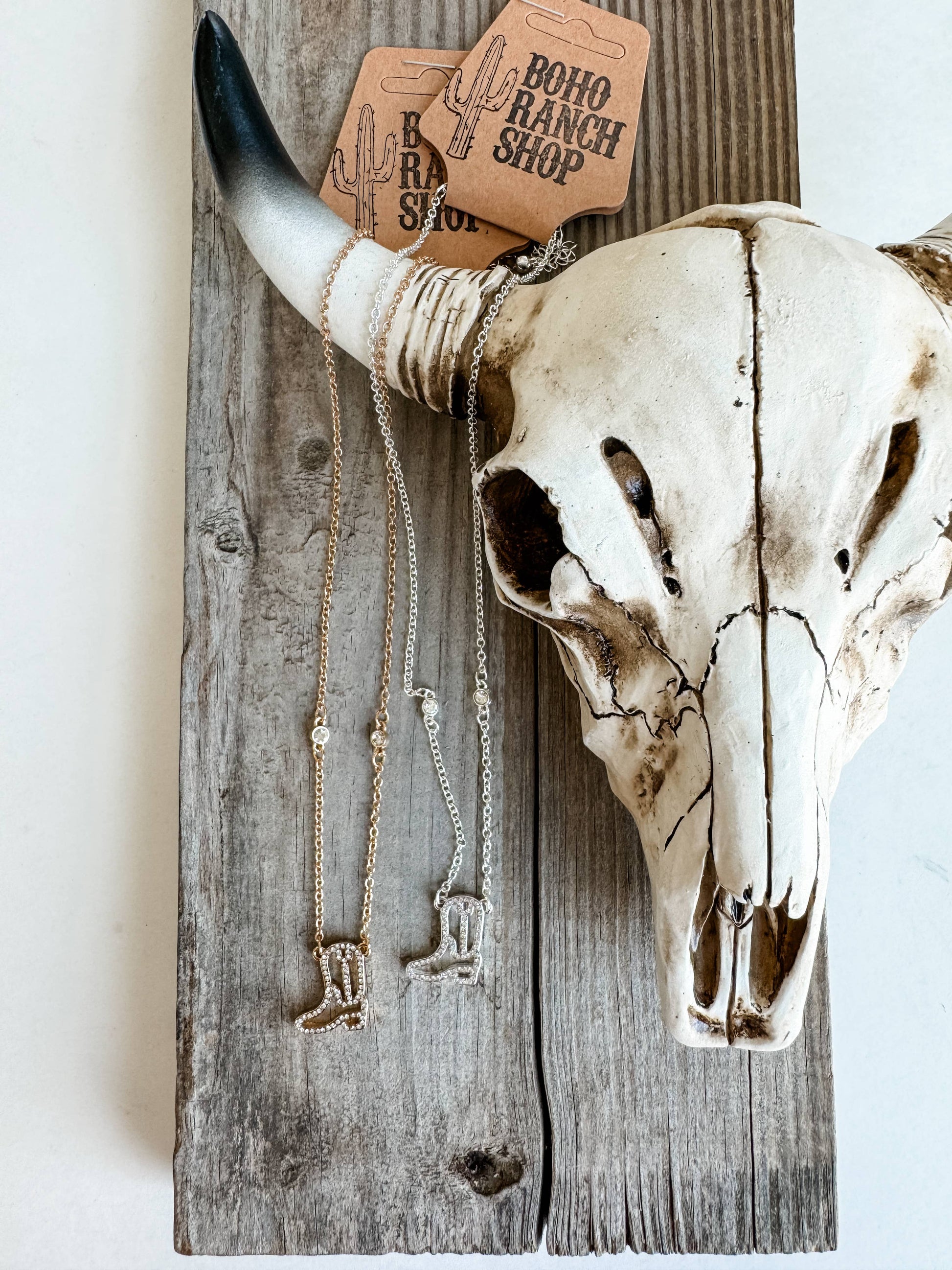 Add a touch of Western charm to your look with our Dainty Western Necklace, the perfect blend of rustic and chic! Available in gold and silver finishes, these delicate necklaces feature cowboy boot and cactus-shaped pendantsadorned with sparkling faux crystal accents for just the right amount of shine.