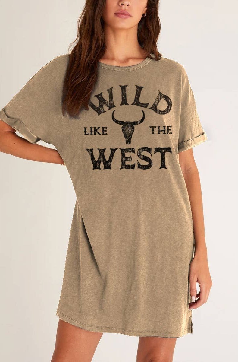 The front showcases the bold statement "Wild Like the West" alongside a striking bull skull print, embodying the rugged and adventurous essence of the Wild West. With its relaxed fit, this t-shirt dress offers both comfort and effortless style, making it perfect for any casual outing or Western-themed event.