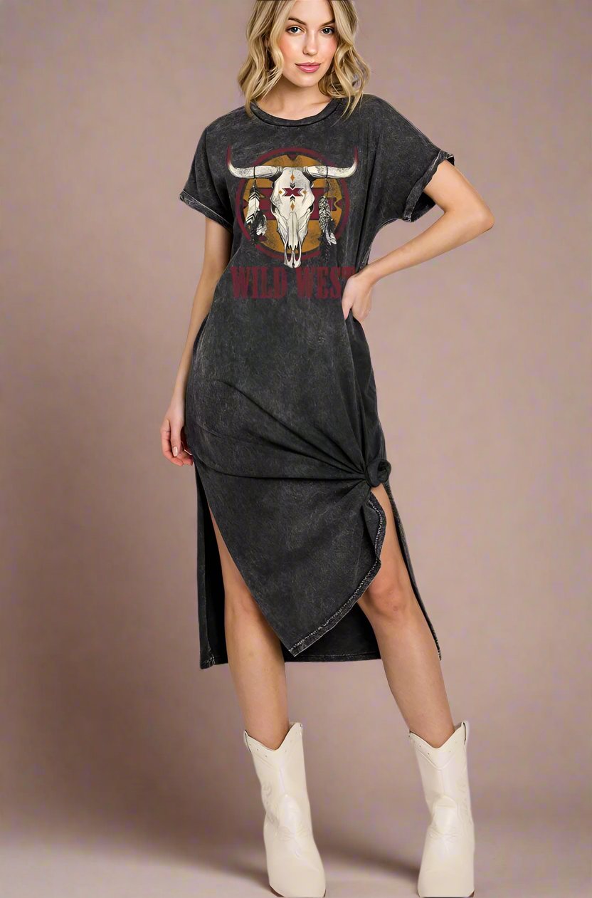 Embrace vintage charm with our Graphic Knee Length Maxi T-Shirt Dress. Whether you're running errands or enjoying a day out with friends, this dress is sure to become a staple in your wardrobe.